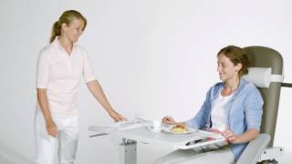 Bordpladen kan nemt tages af og bruges som en serveringsbakke, hvilket gør det ideelt til servering af måltider eller opbevaring af nødvendige plejeartikler. Den lette aftagning og påsætning af bordpladen sikrer en hurtig og praktisk løsning, når du har brug for det.